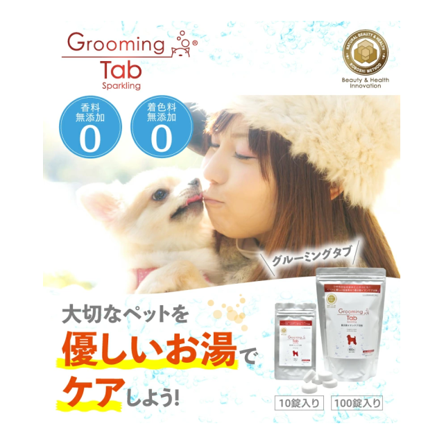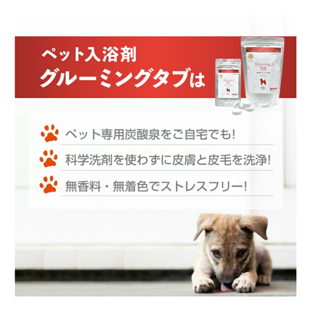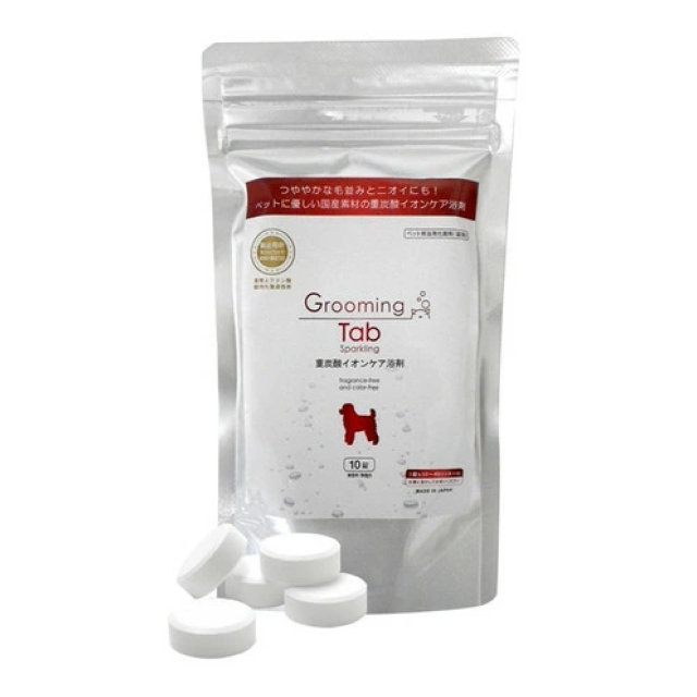 グルーミングタブは、デリケートなペットの皮フ、被毛にやさしい重炭酸イオンケア浴剤です。
