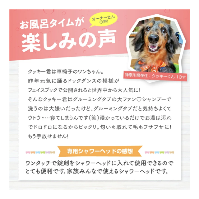 古来から親しまれた清浄剤のクエン酸と重曹で汚れを落とすシンプルな設計のためワンちゃんに負担がかからず、人の手にもやわらかいお湯です。また、残留塩素を中和するため、人間より薄い皮フのデリケートなワンちゃん、ネコちゃんに最適です。