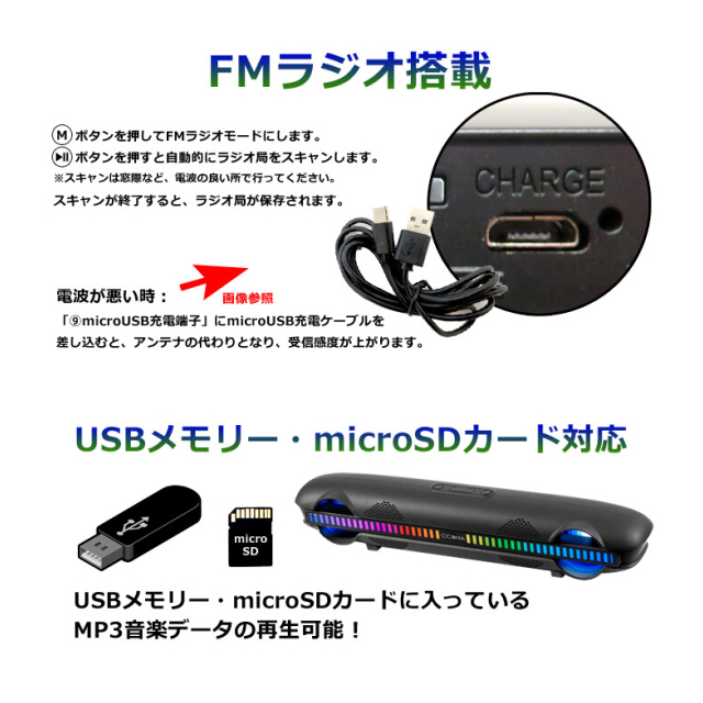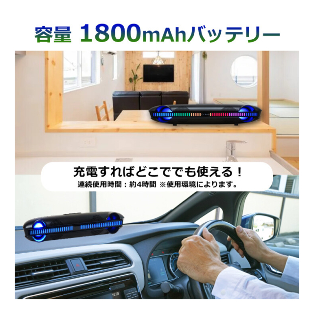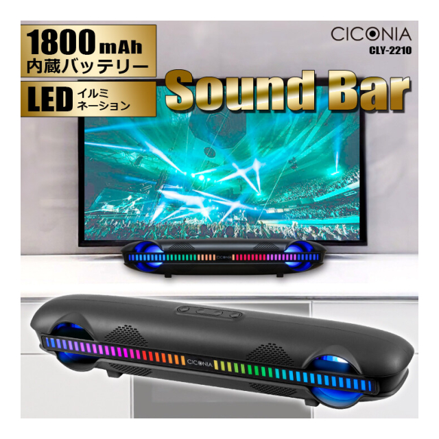 ネットショップ様向け・CICONIA サウンドバー ・充電で車内でも!ラジオや音楽再生・音と連動してLEDが光る
