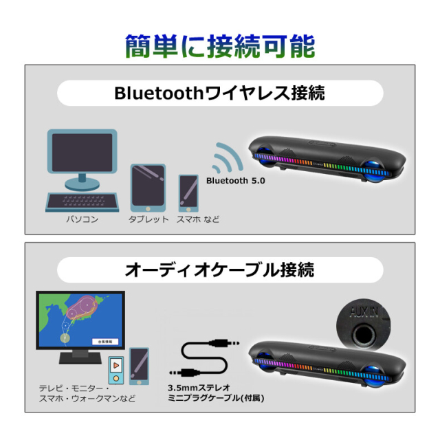 Bluetoothや付属ケーブルで簡単に接続可能。