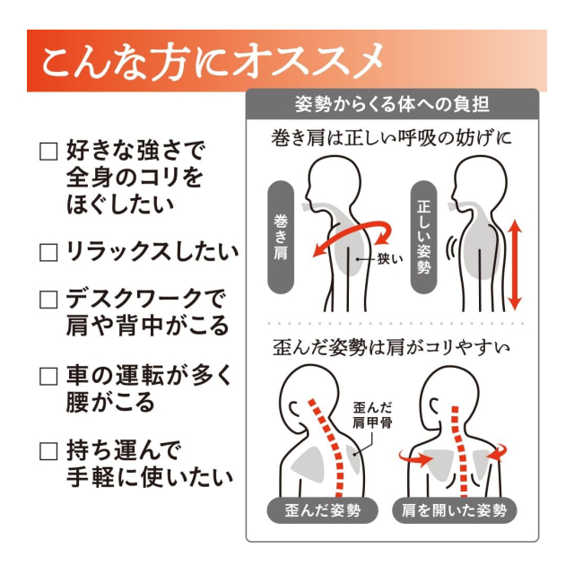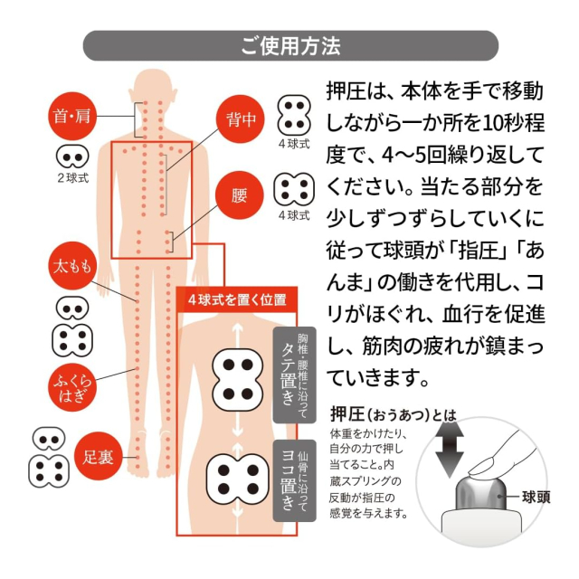 2球式は首すじ・肩用/4球式は背中・腰用。 本器の上に仰向けに寝て、体重をかけるだけの手軽さで球頭が、あんま、指圧と同じ働きをします。 日頃前屈みになりがちな姿勢も本器を使えば後ろにグーンとそって気分爽快です。