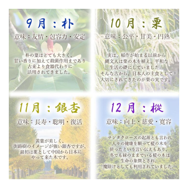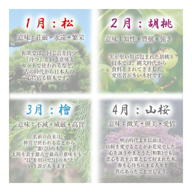 ・種類:松(マツ)、胡桃、檜(ヒノキ)、山桜(ヤマザクラ)、杉樟(クス)、栃、欅、朴、栗、銀杏、樅