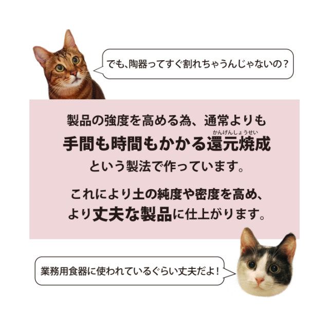Point2:安心・安全の陶製 陶磁器の一大生産地である、岐阜県土岐市で作られたこだわりの陶製(美濃焼)です。 カドミウム・亜鉛などを含む原材料は使用せず、人間と同じ安全基準をクリアしています。 陶製の器は、傷が付きづらく雑菌が繁殖しずらいので、清潔を保ちやすくなっています。 なにかと心配な陶磁器の破損を防ぐため、通常よりも手間と時間がかかる「還元焼成」という方法で作っています。これにより土の純度や密度を高め、より割れずらい丈夫な製品に仕上げています。 電子レンジ・食洗機にも対応しているので、フードのあたためや、器のお手入れにご活用いただけます。