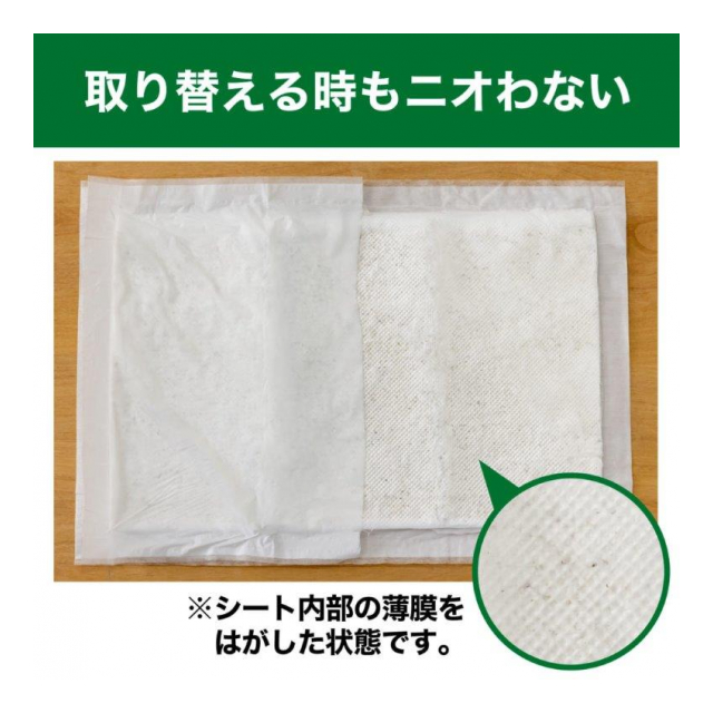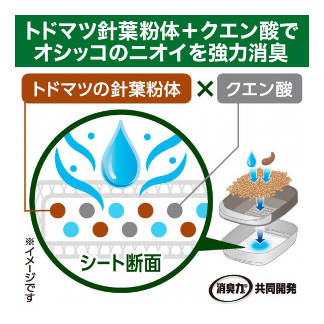 | 原材料:北海道産トドマツ針葉粉体、ポリオレフィン系不織布、綿状パルプ、吸水紙、高分子吸水剤、ポリエチレンフィルム、ホットメルト接着剤、抗菌剤、クエン酸 製造国:日本 発売元:エステー ●シート単体では使用しない。●本品は食べられない。●用途以外に使用しない。●万一誤って食べた場合には、医師・獣医師に相談する。 |