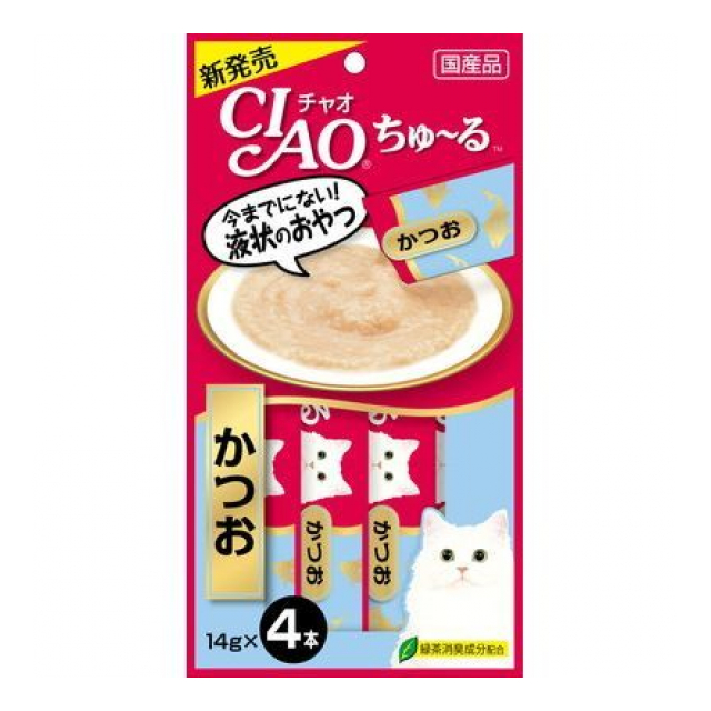 | 原材料:かつお、かつお節エキス、糖類(オリゴ糖等)、植物性油脂、増粘安定剤(加工でん粉、増粘多糖類)、ミネラル類(Na,P,Cl)、調味料(アミノ酸等)、ビタミンE、緑茶エキス、紅麹色素、カラメル色素 製造国:日本 発売元:いなばペットフード株式会社 |