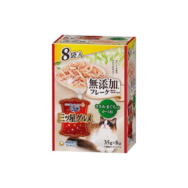 | 原材料:魚介類(かつお、まぐろ)、ささみ、酵母エキス、コーンスターチ、増粘多糖類 発売元:ユニ・チャーム |