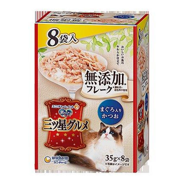| 原材料:魚介類(かつお、まぐろ)、酵母エキス、コーンスターチ、増粘多糖類 発売元:ユニ・チャーム |