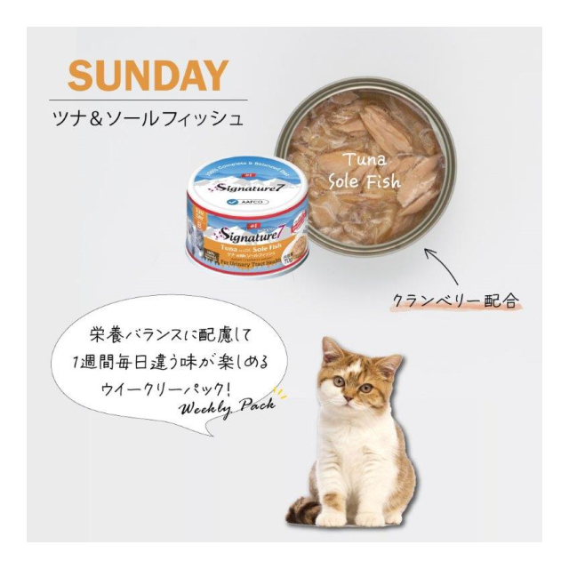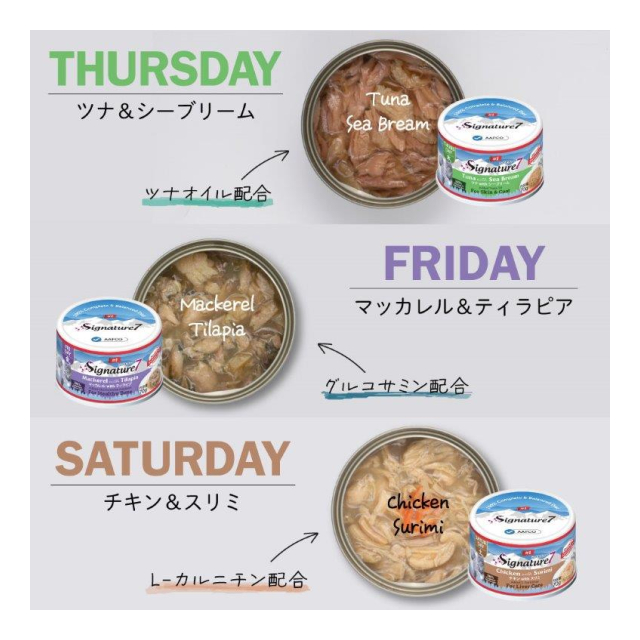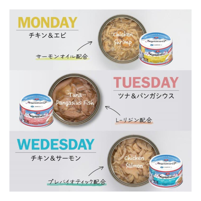 | 原材料: 【月】チキンwithシュリンプ/S7-G1A 【原材料】チキン、エビ、大豆油、フレーバーエンハンサー、酵母エキス、ビタミン&ミネラル、ツナエキス、グアーガム、タウリン、サーモンオイル 【火】ツナwithパンガシウス/S7-G2A 【原材料】ツナ、パンガシウス、大豆油、フレーバーエンハンサー、酵母エキス、ビタミン&ミネラル、ツナエキス、グアーガム、タウリン、L-リジン 【水】チキンwithサーモン/S7-G3A 【原材料】チキン、サーモン、大豆油、フレーバーエンハンサー、酵母エキス、ビタミン&ミネラル、ツナエキス、グアーガム、タウリン、プレバイオティクス 【木】ピュアツナwithシーブリーム/S7-G4A 【原材料】ツナ、タイ、大豆油、フレーバーエンハンサー、酵母エキス、ビタミン&ミネラル、ツナエキス、グアーガム、タウリン、ツナオイル 【金】ピュアマッカレルwithティラピア/S7-G5A 【原材料】サバ、ティラピア、大豆油、フレーバーエンハンサー、酵母エキス、ビタミン&ミネラル、ツナエキス、グアーガム、タウリン、グルコサミン硫酸塩 【土】チキンwithスリミ/S7-G6A 【原材料】チキン、カニカマ、大豆油、フレーバーエンハンサー、酵母エキス、ビタミン&ミネラル、ツナエキス、グアーガム、タウリン、L-カルニチン 【日】ツナwithソールフィッシュ/S7-G7A 【原材料】ツナ、ソールフィッシュ、大豆油、フレーバーエンハンサー、酵母エキス、ビタミン&ミネラル、ツナエキス、グアーガム、タウリン、クランベリーエキス 製造国:タイ 個装サイズ(cm)・重量(g):縦22.3奥行7横7重量736 賞味期限・使用期限期間:36か月 開封後は冷蔵庫で保管し、48時間以内に使用して下さい。 |