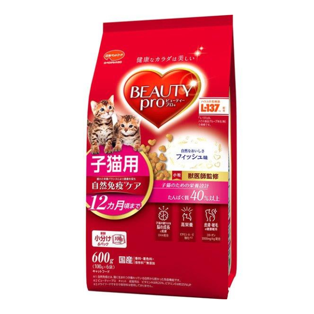 子猫期の健康で元気な成長を願い、たんぱく質40%以上、ビタミン強化。(ビューティープロキャット成猫用比約25%アップ)
