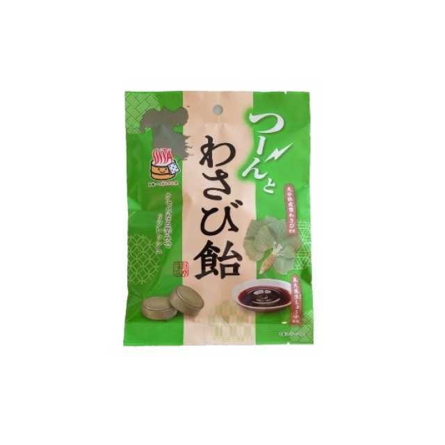 大分県産葉わさびのつーんとした辛味と丸大豆生しょうゆのうまみがクセになる飴です。