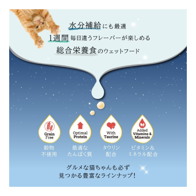 | 原材料:『チキン&しらす』チキン、水、シラス、大豆油、ビタミン・ミネラル類(第三リン酸カルシウム、塩化コリン、塩化カリウム、塩化ナトリウム、硫酸マグネシウム、α-トコフェロール、酸化亜鉛、ニコチン酸、酢酸レチノール、たんぱく質キレート銅、硫酸マンガン、硫酸第一鉄、チアミン硝酸塩、第二リン酸カルシウム、パントテン酸カルシウム、リボフラビン、ピリドキシン塩酸塩、ビオチン、亜セレン酸ナトリウム、ビタミンB12、コレカルシフェロール、ビタミンK、ヨウ化カリウム、葉酸、酸化マグネシウム)、タピオカデンプン、カルボキシメチルセルロースナトリウム、タウリン、乾燥タイムの葉 『ツナ&かにかま』ツナ、水、かにかま、大豆油、ビタミン・ミネラル類(第三リン酸カルシウム、塩化コリン、塩化カリウム、塩化ナトリウム、硫酸マグネシウム、α-トコフェロール、酸化亜鉛、ニコチン酸、酢酸レチノール、たんぱく質キレート銅、硫酸マンガン、硫酸第一鉄、チアミン硝酸塩、第二リン酸カルシウム、パントテン酸カルシウム、リボフラビン、ピリドキシン塩酸塩、ビオチン、亜セレン酸ナトリウム、ビタミンB12、コレカルシフェロール、ビタミンK、ヨウ化カリウム、葉酸、酸化マグネシウム)、タピオカデンプン、カルボキシメチルセルロースナトリウム、タウリン、ビタミンBミックス 『ピュアチキン』チキン、水、大豆油、ビタミン・ミネラル類(第三リン酸カルシウム、塩化コリン、塩化カリウム、塩化ナトリウム、硫酸マグネシウム、α-トコフェロール、酸化亜鉛、ニコチン酸、酢酸レチノール、たんぱく質キレート銅、硫酸マンガン、硫酸第一鉄、 チアミン硝酸塩、第二リン酸カルシウム、パントテン酸カルシウム、リボフラビン、ピリドキシン塩酸塩、ビオチン、亜セレン酸ナトリウム、ビタミンB12、コレカルシフェロール、ビタミンK、ヨウ化カリウム、葉酸、酸化マグネシウム)、タピオカデンプン、エンドウ豆繊維、カルボキシメチルセルロースナトリウム、亜麻仁、 タウリン 『ツナ&しらす』ツナ、水、シラス、大豆油、ビタミン・ミネラル類(第三リン酸カルシウム、塩化コリン、塩化カリウム、塩化ナトリウム、硫酸マグネシウム、α-トコフェロール、酸化亜鉛、ニコチン酸、酢酸レチノール、たんぱく質キレート銅、硫酸マンガン、硫酸第一鉄、チアミン硝酸塩、第二リン酸カルシウム、パントテン酸カルシウム |