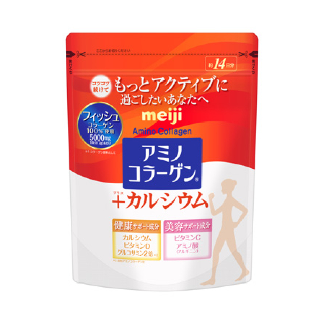 | 原材料:魚コラーゲンペプチド(国内製造)、マルトデキストリン、植物油脂/炭酸Ca、グルコサミン、ビタミンC、アルギニン、増粘剤(アラビアガム)、乳化剤、香料、ビタミンD、(一部にオレンジ・キウイフルーツ・大豆・ゼラチンを含む) 個装サイズ(cm)・重量(g):縦20奥行8.2横15重量110 発売元:株式会社明治 |