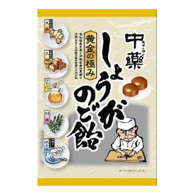 | 原材料:水飴(国内生産)、砂糖、黒糖、生姜粉末、はちみつ、甘草エキス、食塩 個装サイズ(cm)・重量(g):縦22奥行3横13.5重量75 発売元:株式会社中部薬品工業 |