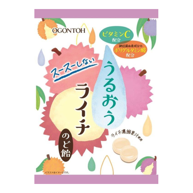 | 原材料:砂糖(国内製造)、水飴、ライチ濃縮果汁/酸味料、ビタミンC、ポリグルタミン酸、香料、(一部に大豆を含む) 発売元:株式会社黄金糖 賞味期限・使用期限期間:365日 |