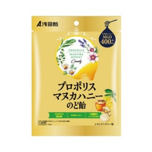| 原材料:砂糖(国内製造)、水飴、はちみつ、プロポリス抽出物、しょうが、プロポリスエキス末、還元麦芽糖水飴、ハーブエキス/酸味料、香料、加工デンプン 個装サイズ(cm)・重量(g):縦20奥行2.3横15重量68 発売元:株式会社浅田飴 |