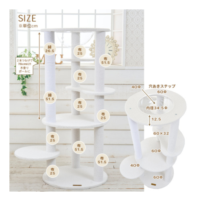| 原材料:台座・ステップ台:木質ボードに生地貼り ポール:紙管に綿縄巻き、生地貼り クリアボウル:プラスチック ネジ:スチール 製造国:企画・デザイン:日本(Mau) 製造:中国 個装サイズ(cm)・重量(g):縦31.5奥行61.5横61.5 発売元:株式会社Mau |