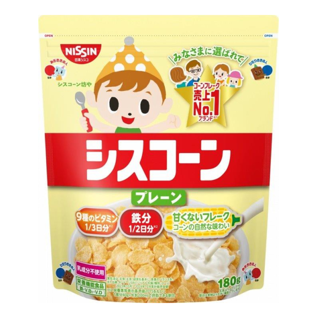 | 原材料:コーングリッツ(国内製造)、砂糖、食塩/ビタミンC、炭酸カルシウム、ピロリン酸鉄、乳化剤、ナイアシン、酸化防止剤(ビタミンE)、パントテン酸カルシウム、ビタミンB6、ビタミンB1、ビタミンB2、葉酸、ビタミンD、ビタミンB12 発売元:日清シスコ株式会社 |