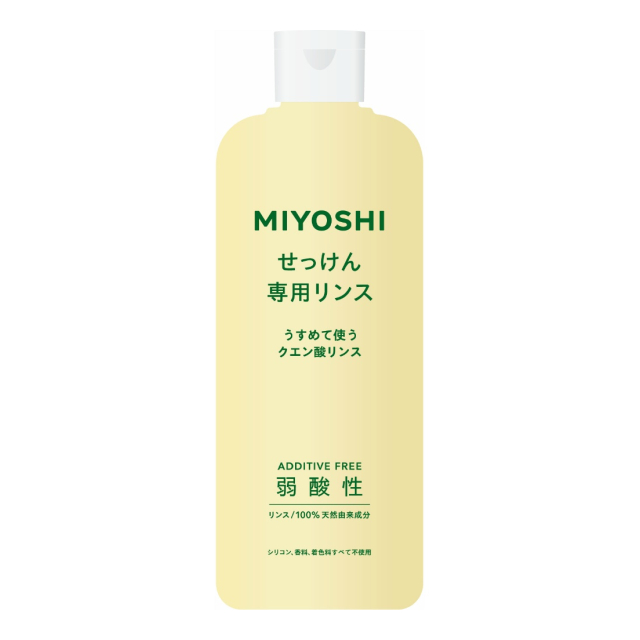 無添加せっけんシャンプーでの洗髪後は、きしみを和らげる弱酸性のクエン酸リンスで洗い上がりスッキリ。
