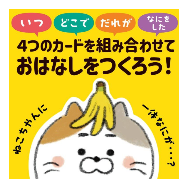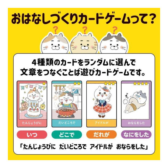 「いつ」「どこで」「だれが」「どうした」の4つ言葉を組み合わせておはなしをつくるカードゲームです。