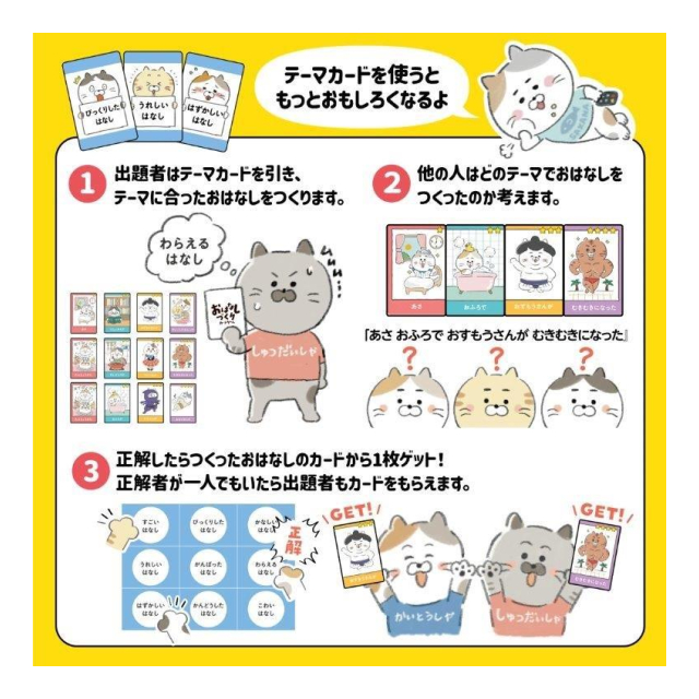 4種類それぞれの山札から1枚づつカードを引いてお話を作る遊びと、出題者がテーマカードを引いてそれにあったお話をつくり、解答者がそれを当てるゲームができます。
