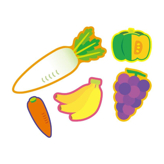 裏面には1?9の数字と、それぞれのくだもの・やさいの数え方(ひと粒、ふた玉など)、ひらがなカタカナと英語の名称が書かれているため、言語学習として使っていただくことも可能です。