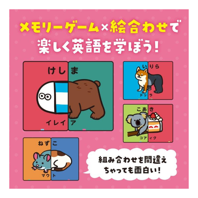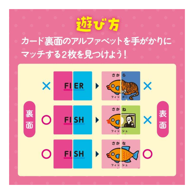 まえカードとうしろカードの英語を合わせて単語をつくり、裏返したときにその単語に合ったイラストになったらカードをもらえます。