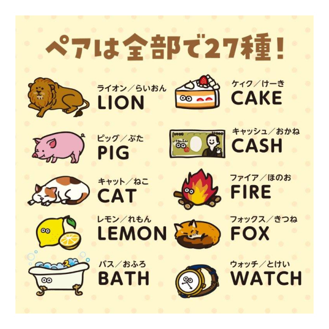 まえカードと組み合わて単語ができるうしろカードは複数パターンあるため、英単語を作っても、裏返すまでは単語とイラストが一致しているかは分からないという運要素も入ったカードゲームです。
