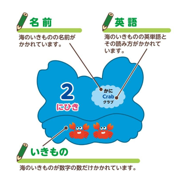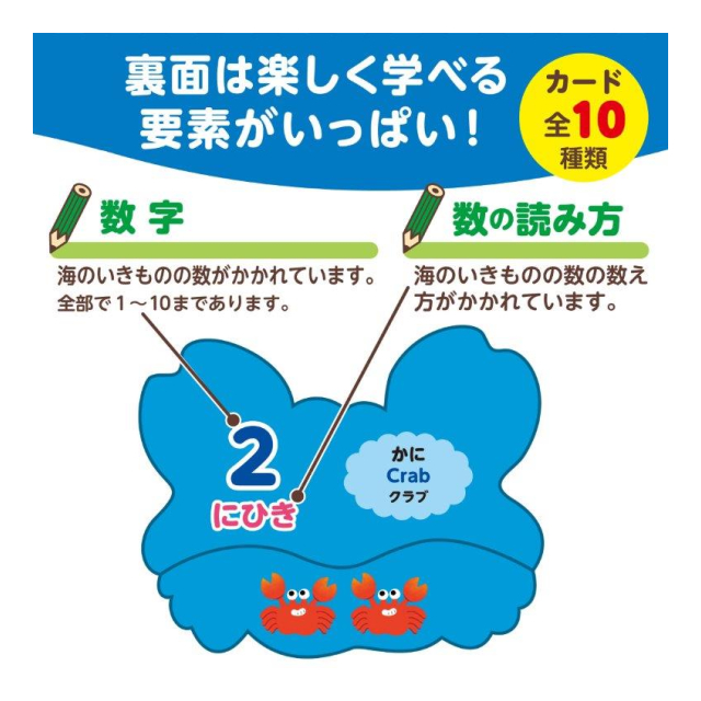 裏面には1?9の数字と、それぞれのいきもののの数え方(三匹、四頭など)、ひらがなカタカナと英語の名称が書かれているため、言語学習として使っていただくことも可能です。