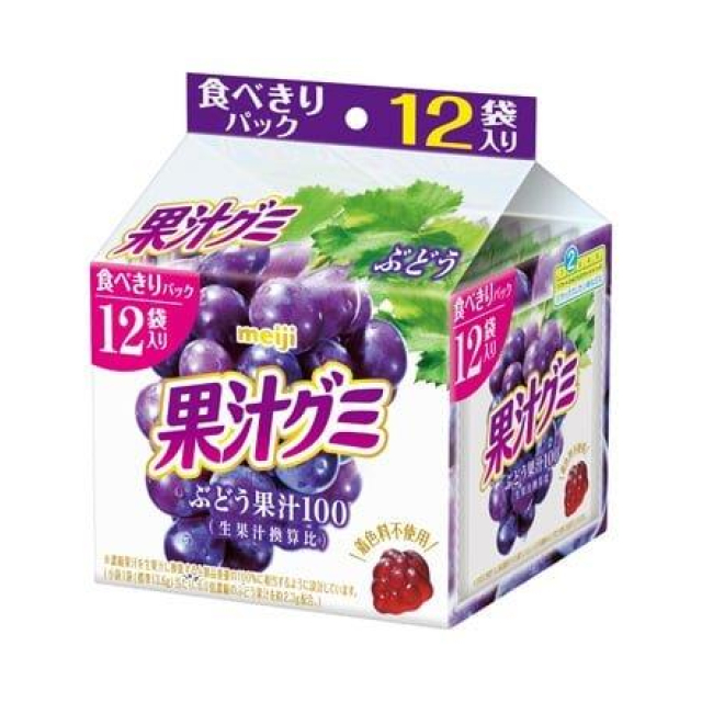 | 原材料:水あめ(国内製造)、砂糖、濃縮ぶどう果汁、ゼラチン、食用油脂、でん粉/酸味料、ゲル化剤(ペクチン)、香料、光沢剤、(一部にりんご・ゼラチンを含む) 発売元:株式会社明治 |