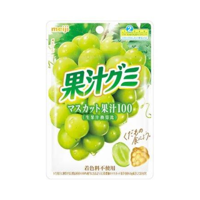 | 原材料:水あめ(国内製造)、砂糖、濃縮マスカット果汁、ゼラチン、食用油脂、でん粉/酸味料、香料、ゲル化剤(ペクチン)、光沢剤、(一部にりんご・ゼラチンを含む) 発売元:株式会社明治 |
