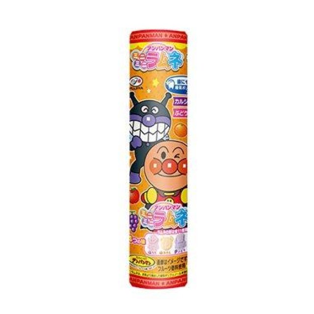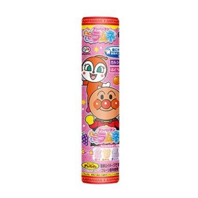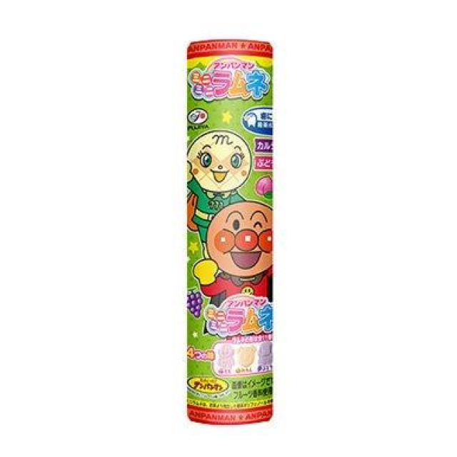 お子様が手に持ちやすい容器に入った、アンパンマンキャラクターの形の、4つの味(もも味、みかん味、ぶどう味、りんご味)が楽しめる小粒ラムネです。