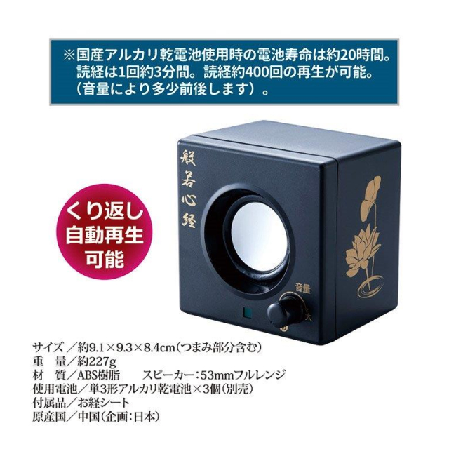 ※国産アルカリ乾電池使用時の電池寿命は約20時間。読経は1回約3分間。読経約400回の再生が可能。(音量により多少前後します)。