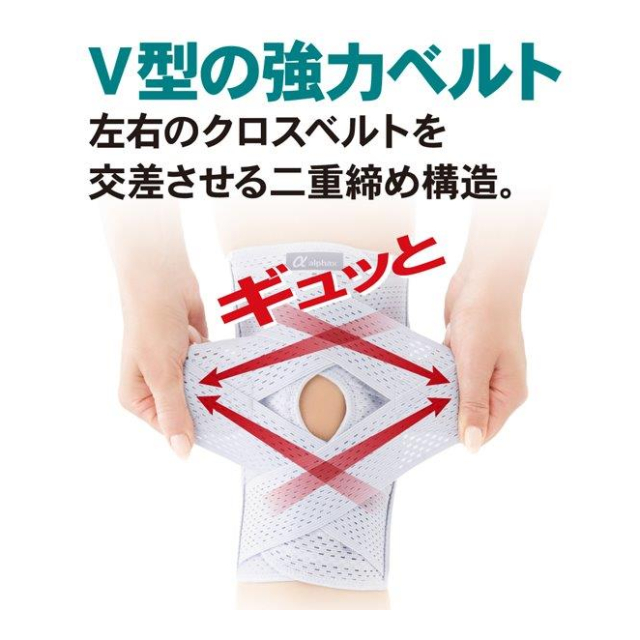 さらに、特殊パッドが膝の皿を抑え、両サイドのV型ベルトでブレを安定させます。