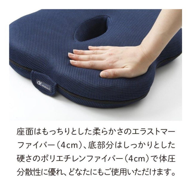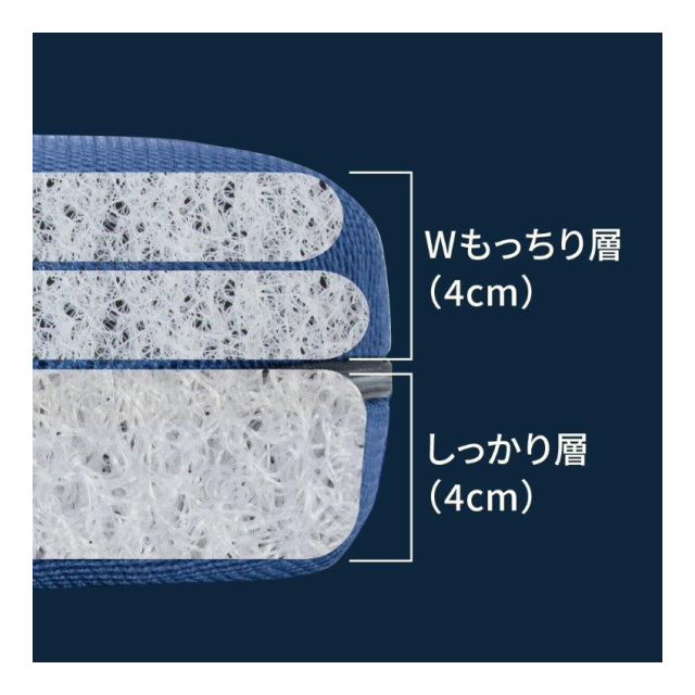座面はもっちりとした柔らかさのエラストマーファイバー(4cm)、底部分はしっかりとした硬さのポリエチレンファイバー(4cm)で体圧分散性に優れ、どなたにもご使用いただけます。