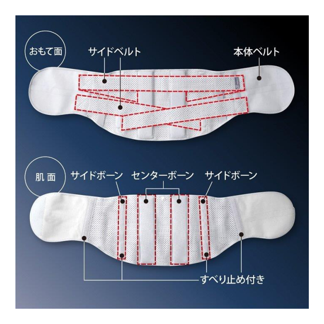 本体ベルト+サイドベルト(上下)が独立しているので、ご自身の身体に沿って調整ができます。