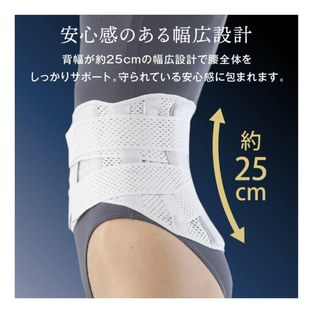 背幅が約25cmの幅広設計で腰全体をしっかりサポート。