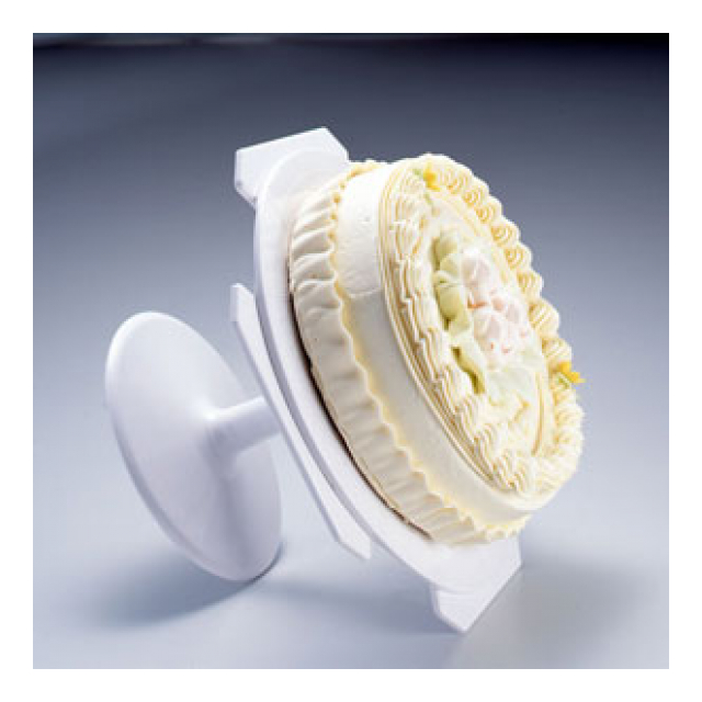 傾けて、ケーキの側面のデコレーションをしたり、平らに置いて回転させながらデコレーションもでき、卓上で足付きのちょっと豪華なケーキスタンドとしても使用でき、ケーキプレートとして何役にも変身。