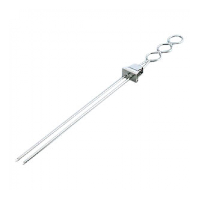 千枚通しの様な魚串と違い、先端がつぶしてアゲになっています。ボックスを移動して使うと、レバー等の柔らかい肉でも2本で刺し込みやすく、うまく返せるので焼き上がりがきれいです。ボックスを先端に移動すれば、焼き上がった肉等がきれいに抜けます。また、ボックスを抜けば、魚も刺せます。
