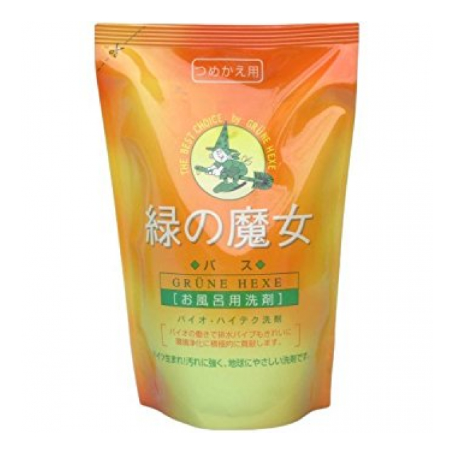「緑の魔女 バス用 詰替 360ml」は、汚れに強く地球にやさしい、おふろ用洗剤「緑の魔女 バス用 420ml」のお得な詰替用です。浴槽、風呂釜の材質をいためず、頑固な湯垢、石けんかすを強力に分解し、ぬめりや皮脂汚れも簡単に落とします。手、肌も安心の中性タイプ。使用後は成分の力で自然の浄化作用を高め、パイプに付着した汚れを落とし、水質もキレイにします。中性。使用後丸めて捨てられる、パウチ入り。