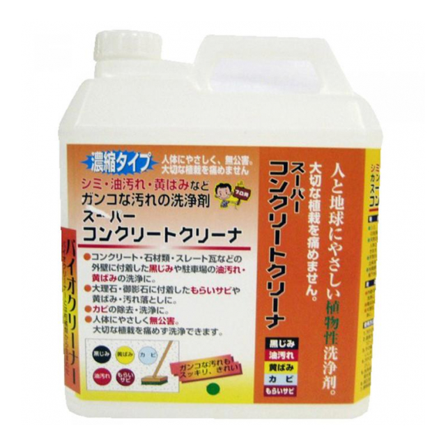 ●シミ・油汚れ・青ゴケなどガンコな汚れの強力洗浄剤(濃縮タイプ)です。●天然の柑橘類植物を主成分とした純植物性なので、人体と環境にやさしく安心して使用することができます。手荒れの心配もなく、庭の植栽を痛めずに作業ができます。●水資源を侵すことがないので、洗浄後の流水を一般下水道に放流しても全く安全です。●黒じみ、駐車場の油よごれ・黄ばみの洗浄に。●大理石、御影石の汚れ落としに。●コンクリートなどに発生した青ゴケやアクの除去に。※汚れ具合によっては完全に取りきれない場合もあります。