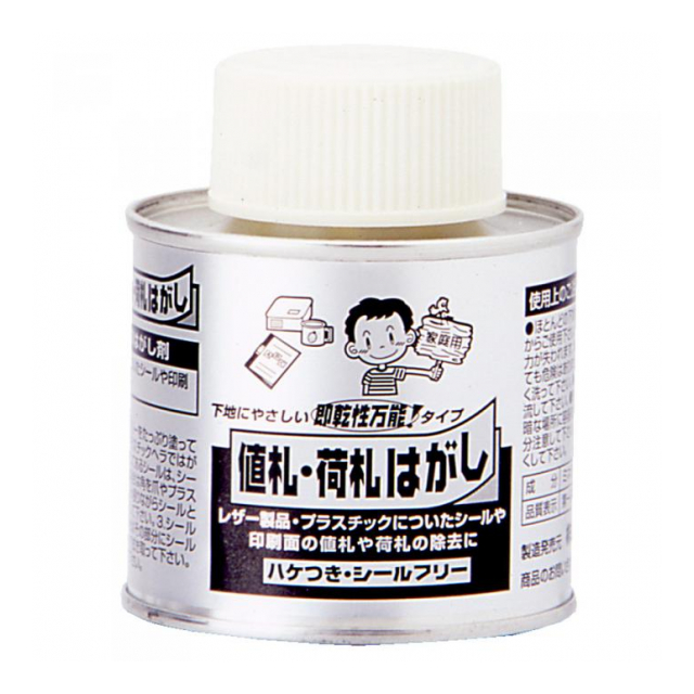 | ●成分:ミネラルスピリット(第一石油類) 1、除去するシールの上に、シールフリーをたっぷり塗って下さい。10秒位で乾きますので乾く前に爪やプラスチックヘラではがします。2、クラフトテープやビニールコーティングしてあるシールは、シールフリーが表面からしみこみません。このような場合は角を爪やプラスチックヘラで少しはがした後で、そのシールを引っ張りながらシールと下地の接着面にシールフリーを塗りながらはがしてください。3、シールやテープをはがした後、残ったノリを除去する場合はその部分にシールフリーをたっぷり塗って、布やティッシュペーパーで拭き取ってください。※一度で取れない場合は、同じ作業を繰り返して下さい。 ご使用の前に目立たない場所で必ず試し塗りをして安全を確認して下さい。●シールフリーは即乾タイプですので乾いてしまうと効力が失われます。●はがし難い時は、再度塗布して下さい。●皮膚についても危険はありませんが、念のため使用後は石鹸などでよく洗って下さい。●目や口に入った場合はすぐに水で洗い流して下さい。●使用後は密栓し、幼児の手の届かない冷暗な場所に容器を立てて保管して下さい。●火気には十分注意してください。●使用中、使用後はしばらく換気をよくして下さい。 |