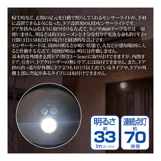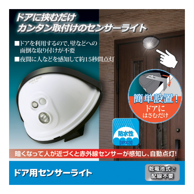 カンタンに設置できるようになった、ドア設置用のLEDセンサーライトです。