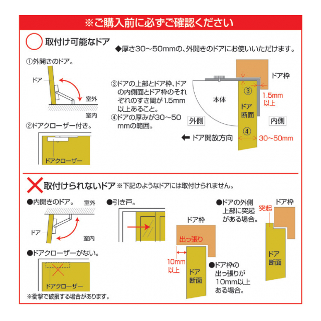 内開きドア、引き戸、ドアクローザーの無いドア、には取付できません。