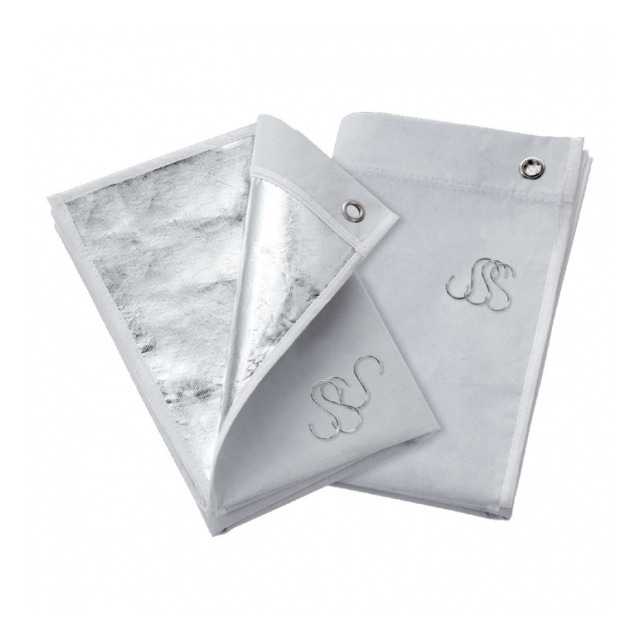 | 原材料:本体:アルミ蒸着ポリエステルシート・ポリプロピレン不織布 バイヤス:ポリプロピレン不織布 ハトメ:アルミ フック:スチール 製造国:中国 個装サイズ(cm)・重量(g):縦40奥行3横30重量385 発売元:メーカー:ウイキャン |