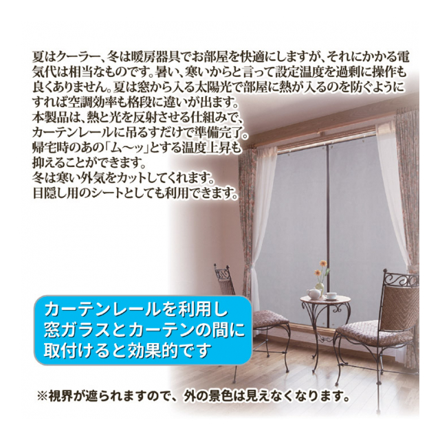 本製品は、熱と光を反射させる仕組みで、カーテンレールに吊るすだけで準備完了。
