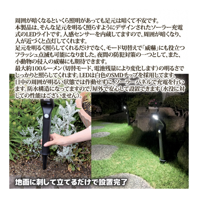 周囲が暗くなるといくら照明があっても足元は暗くて不安です。本製品は、そんな足元を明るく照らすようにデザインされたソーラー充電式のLEDライトです。人感センサーを内蔵してますので、周囲が暗くなり、人が近づくと点灯してくれます。足元を明るく照らしてくれるだけでなく、モード切替えで「威嚇」にも役立つフラッシュ点滅も可能になりました。夜間の防犯対策の一つとして、また、小動物の侵入の威嚇にも期待できます。最大約100ルーメン(切替モード、電池残量により変化します)の明るさでしっかりと照らしてくれます。LEDは白色のSMDチップを採用してます。日中の周囲が明るい状態では作動せずに、ソーラーパネルで充電を行います。防水構造になってますので、屋外で安心して設置できます(水没に対しての性能はございません)。