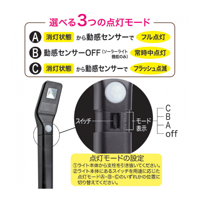 点灯パターン/A:消灯状態から人感知で約30秒間フル点灯 B:常時中点灯(人感センサー停止) C:消灯状態から人感知で約30秒間フラッシュ点滅