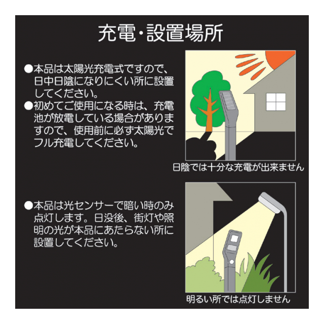 ※スイッチOFF時も充電します。※明るい所では点灯しません。(オフからモード選択時のみ約15秒点灯)※光センサー作動照度目安/約50Lux以下で点灯 約150Lux以上で消灯