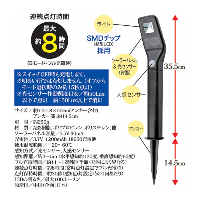 | 原材料:ABS樹脂、ポリプロピレン、ポリスチレン、他 製造国:中国 個装サイズ(cm)・重量(g):縦36奥行8横9.5重量340 ソーラーパネル容量/5.5V 90mA 充電池/3.7V 1200mAh 18650充電池 使用温度範囲/?20?60℃ フル充電時間/約11?12時間(季節・天候により異なる) 連続点灯時間/約8時間(常時点灯設定でフル充電時) 点灯保持時間/約30秒(感知点灯設定時の1回あたり) LEDの明るさ/最大100ルーメン |