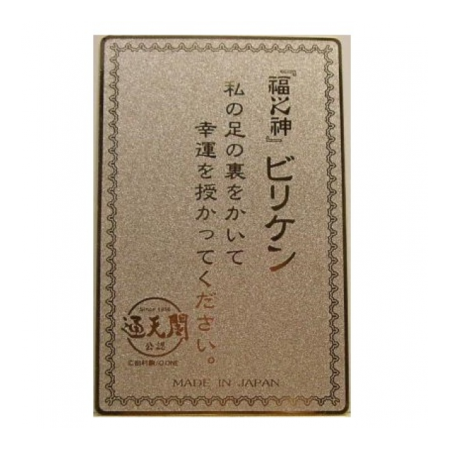 大阪「通天閣公認」のビリケン開運カードです。 ビリケンは明治41年にアメリカで生まれ、皆に「幸福の神様」と呼ばれ、世界中の人気者となりました。 日本では七福神に告ぐ8番目の神様として言われ、ビリケンの足の裏をかけば「願いが叶う」と大好評です。